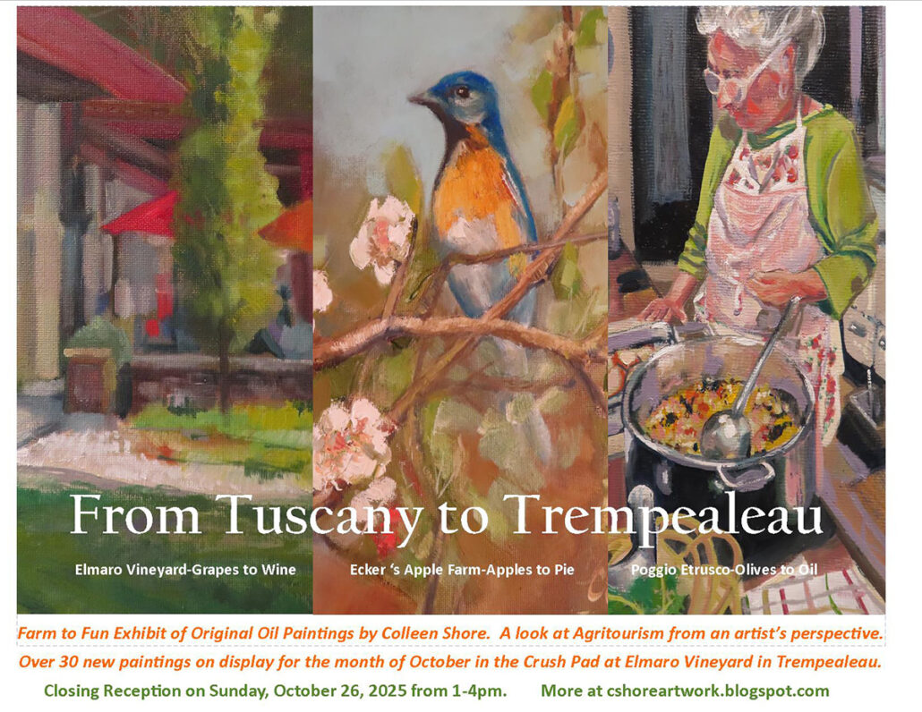 Throughout October, 2025 Elmaro Vineyard (Crush Pad) Artist reception: October 26 | 1-4 PM Agritourism is the focus of my upcoming exhibit of original oil paintings. Inspired by Elmaro Vineyard,…