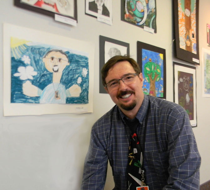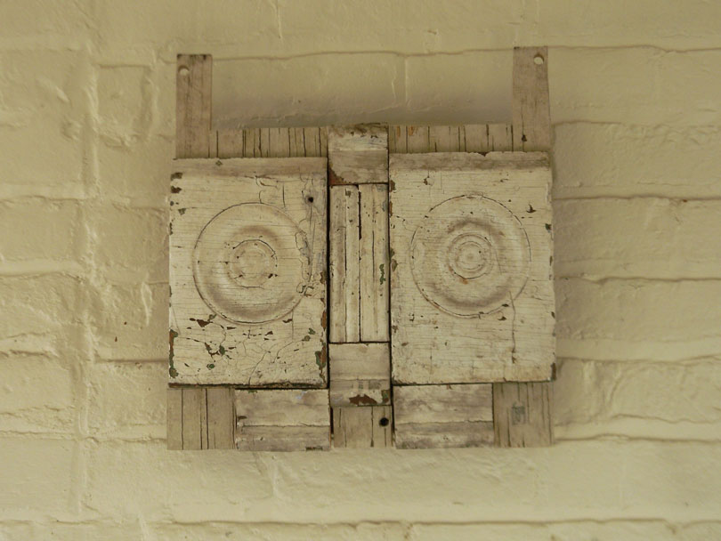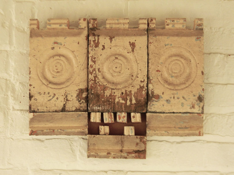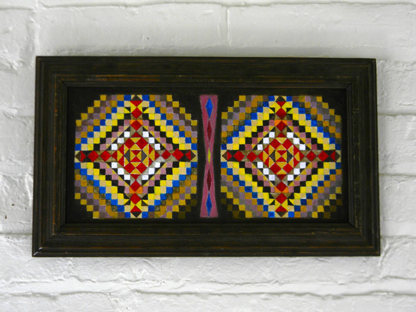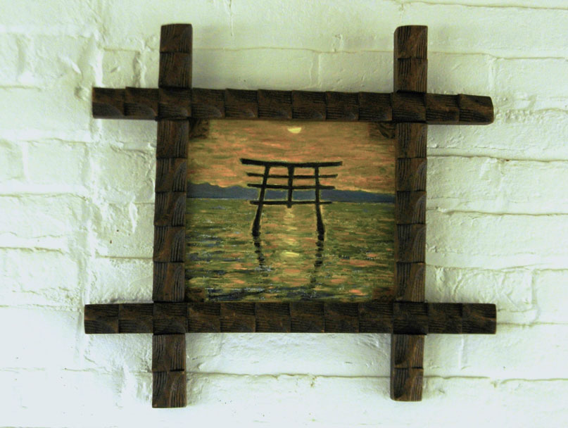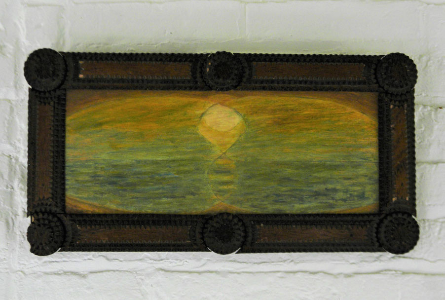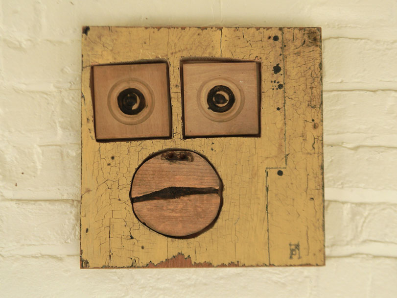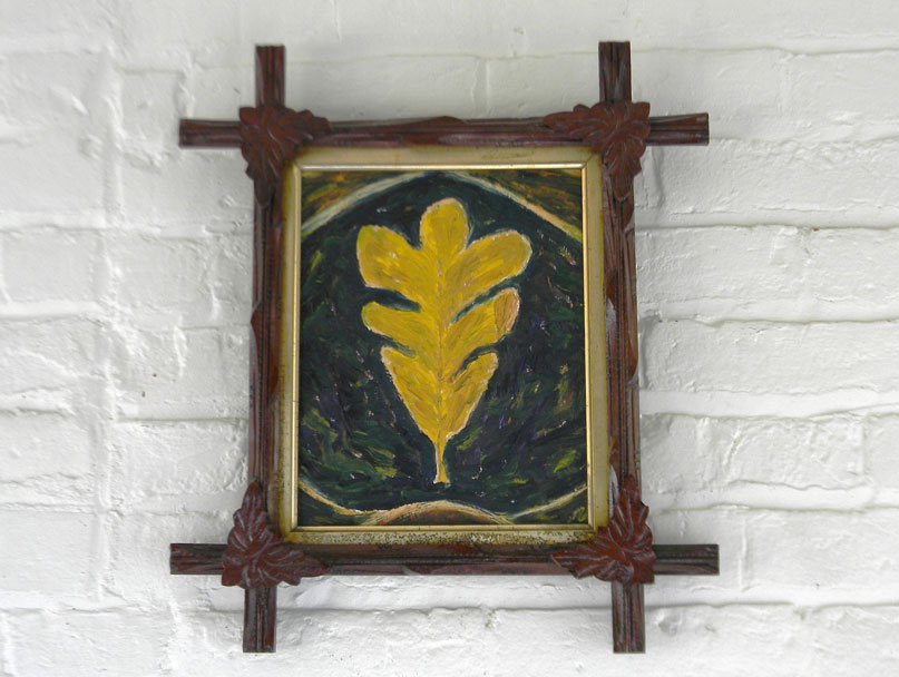 Jeff works mainly in oil and watercolor / gouache paint on prepared paper, canvas and wood panels – or with repurposed wood. While in graduate school (U. of Iowa), he worked in video and performance art, made installations, ceramics and sculpture and gradually started making art objects and from found objects and wood. The natural wood grain, varied hardness and stubborn directness of the medium were all things that attracted and challenged him. In recent years, he has grown fond of and collected antique chip-carved “tramp art” frames and objects. These hearken back to the era of his great-grandparents and before, with their dark stains, markings of age and carving / manufacture like the heavy wooden furniture that has been passed down to him from his grandparents. These pieces of furniture were themselves early teachers in developing his aesthetic and love of the hand-made.