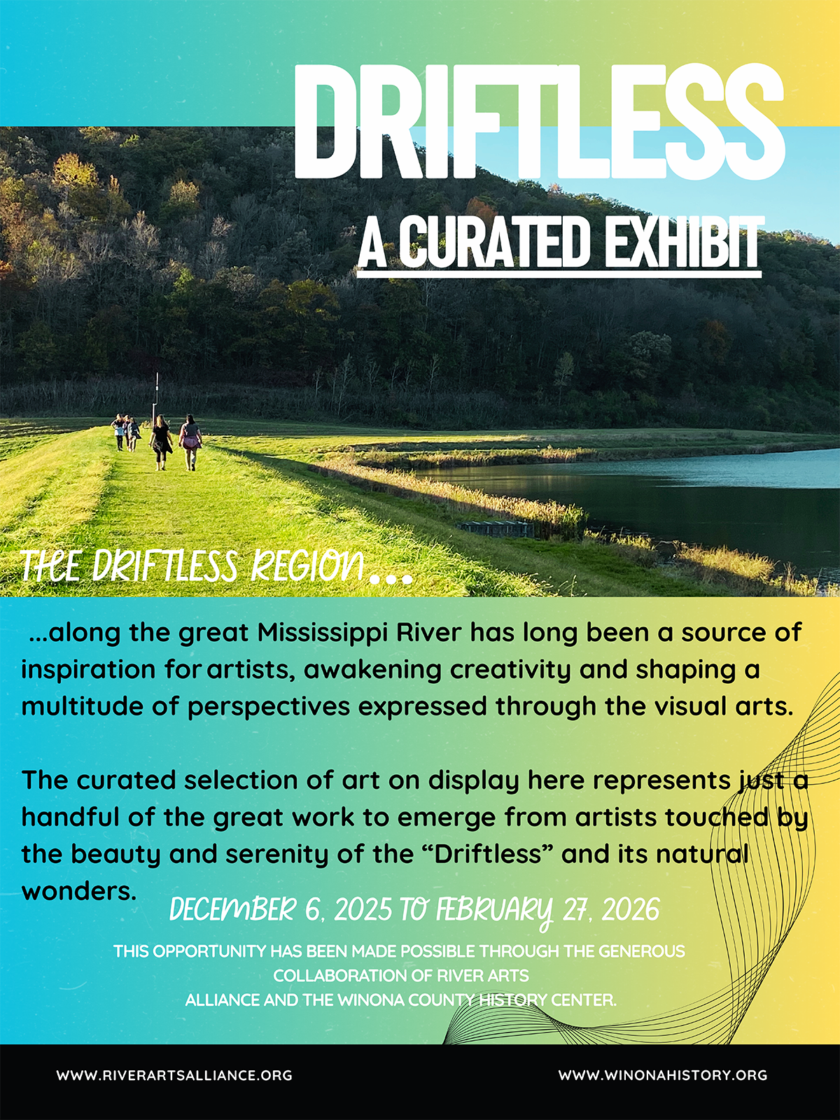 Many artists throughout Minnesota and the surrounding driftless region submitted worksfor consideration in the exhibit. A selection of those submissions, curated by former and current RAA board members, will be on display at the Winona County History Center, December 6, 2025 – February 27, 2026.