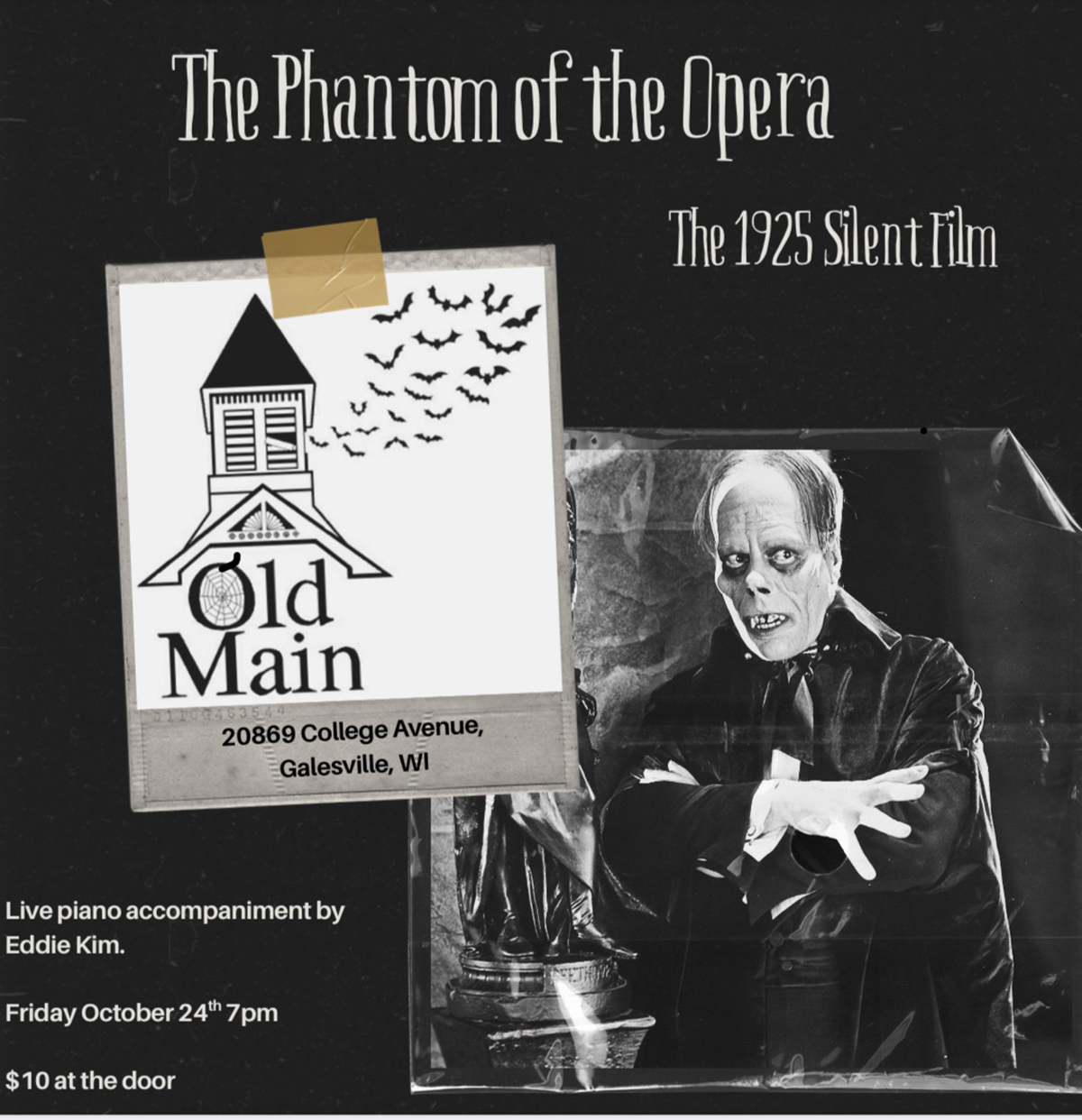 Phantom of the Opera at Old Main By Terri Karsten | 10/16/2025 | 0 October 31 | 7 pm Old Main Cultural Center 20869 College Ave, Galesville, WI 54630 Silent Film with Eddie Kim pianist accompaniment Posted in Events, Films, Music, Performance